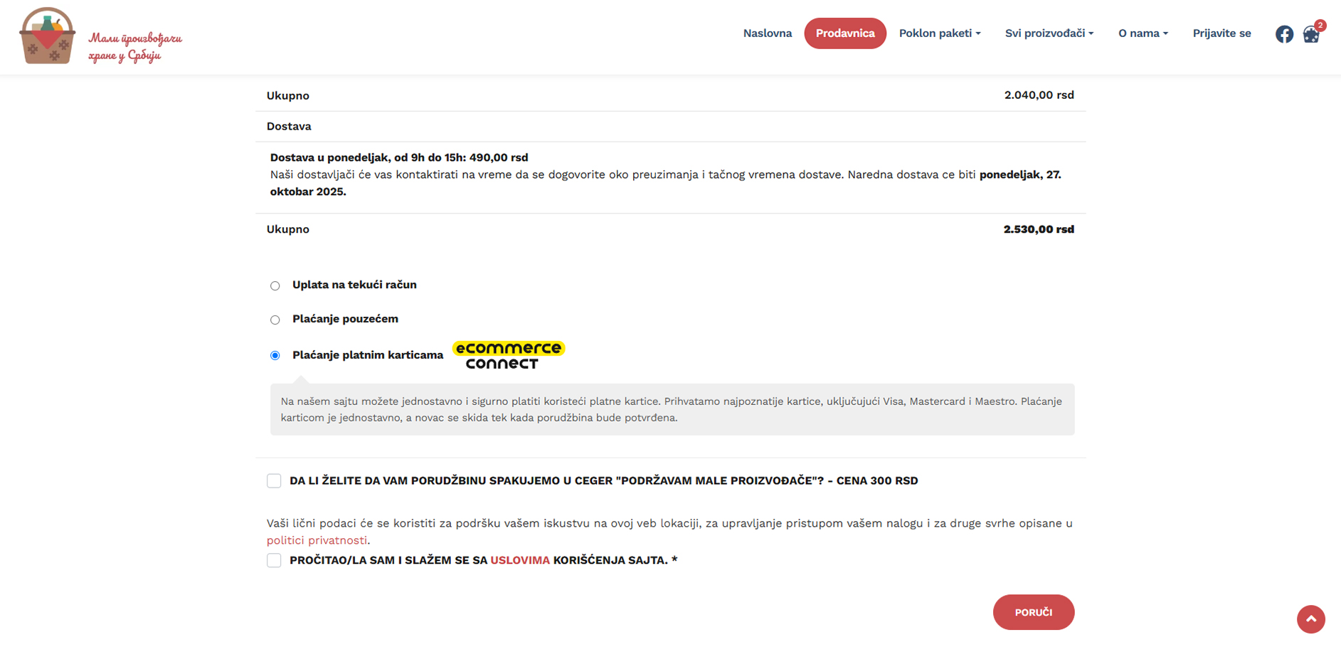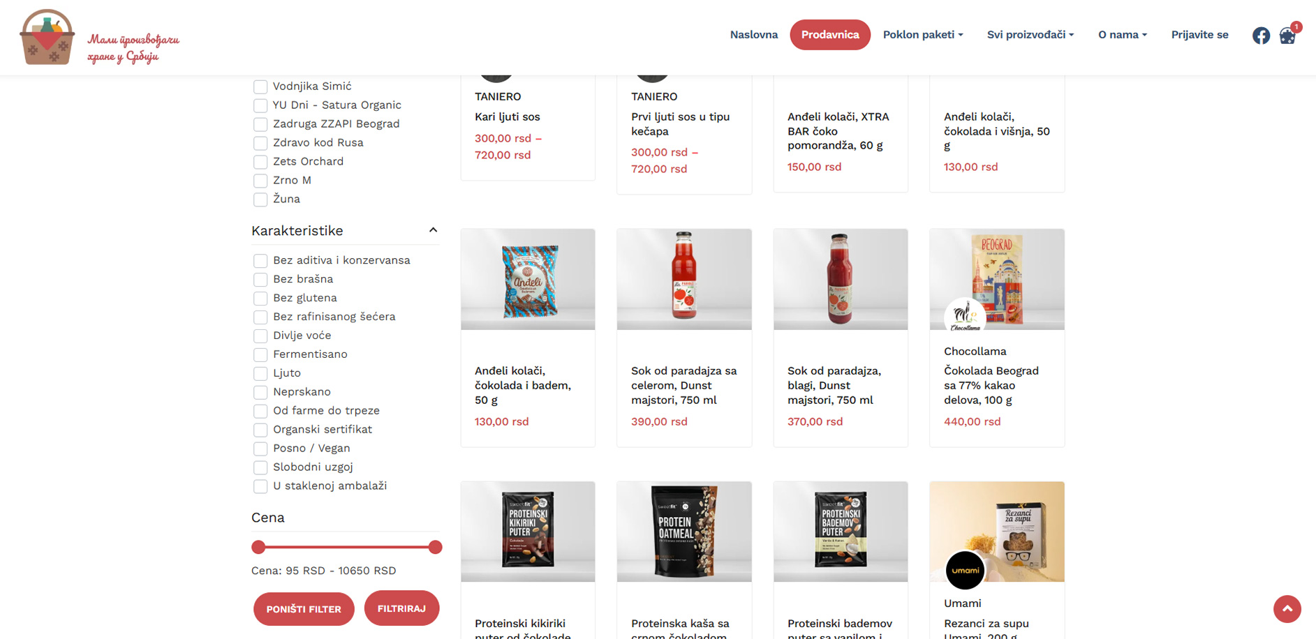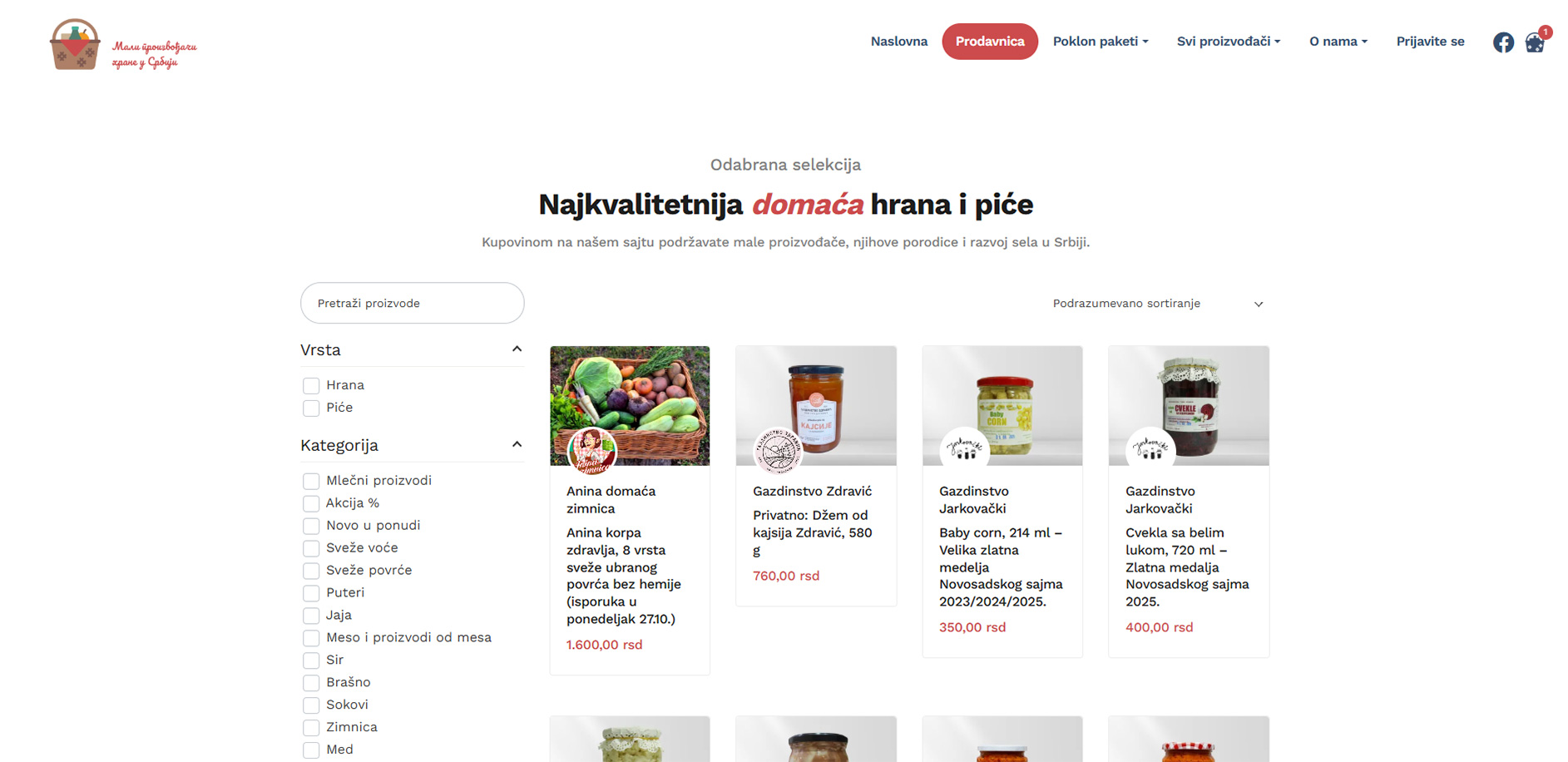 An online platform connecting small local food and beverage producers with customers. The platform is designed to make it easy for sellers to create their profiles and showcase their products on the website. Customers can register on the site to communicate with producers regarding orders through private messages, which are implemented on the site and enable direct communication between buyers and sellers. They also have the option to add producers to their favorites and follow the latest updates from their preferred sellers. The platform also features a store that allows products to be sold directly through the website. Customers can order available products by adding them to their cart, and the items will be delivered to their address.
